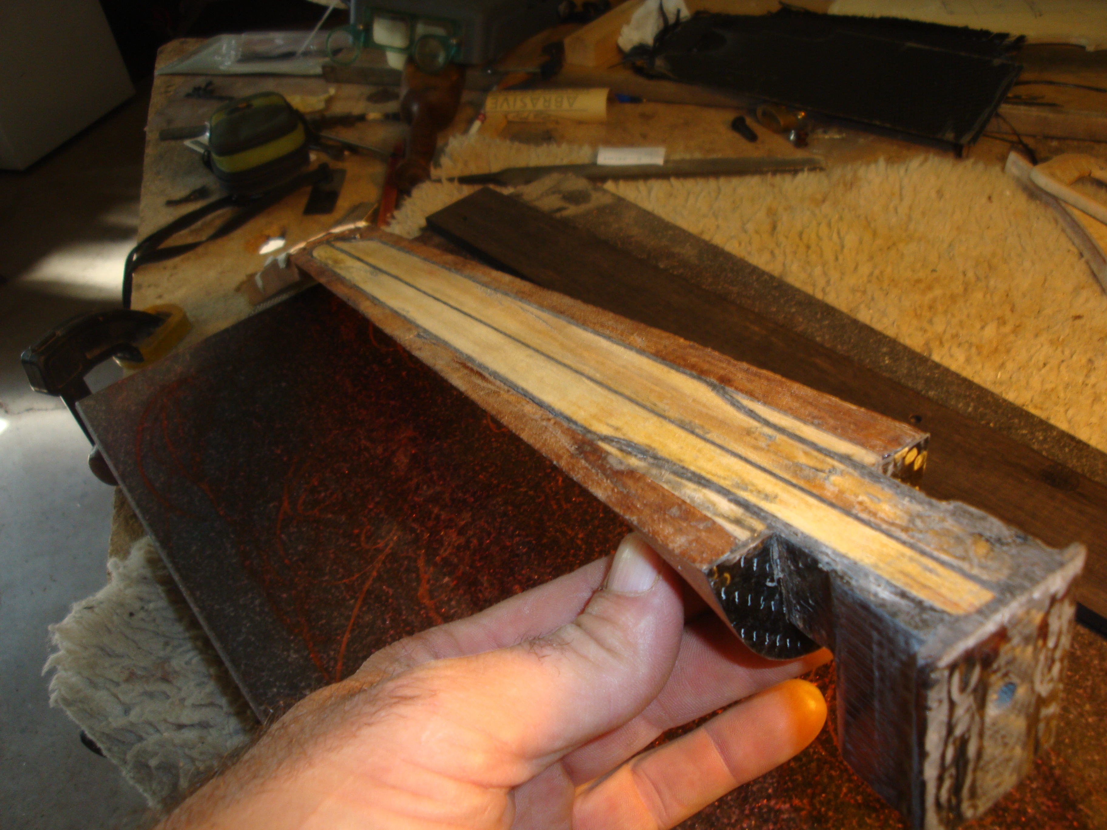 First I'll shape the Willow core and heat bend the outer wood veneer.