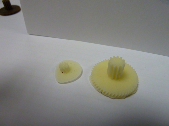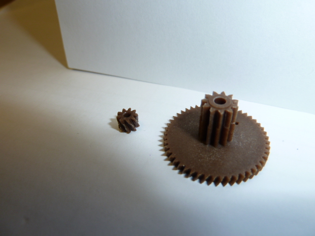 I have attached a couple of photographs to show you what we are trying to replicate.  The dark gears are the originals and the white are our first attempts though as I say we are seeing better results now.  The small gear is around 5mm in diameter.