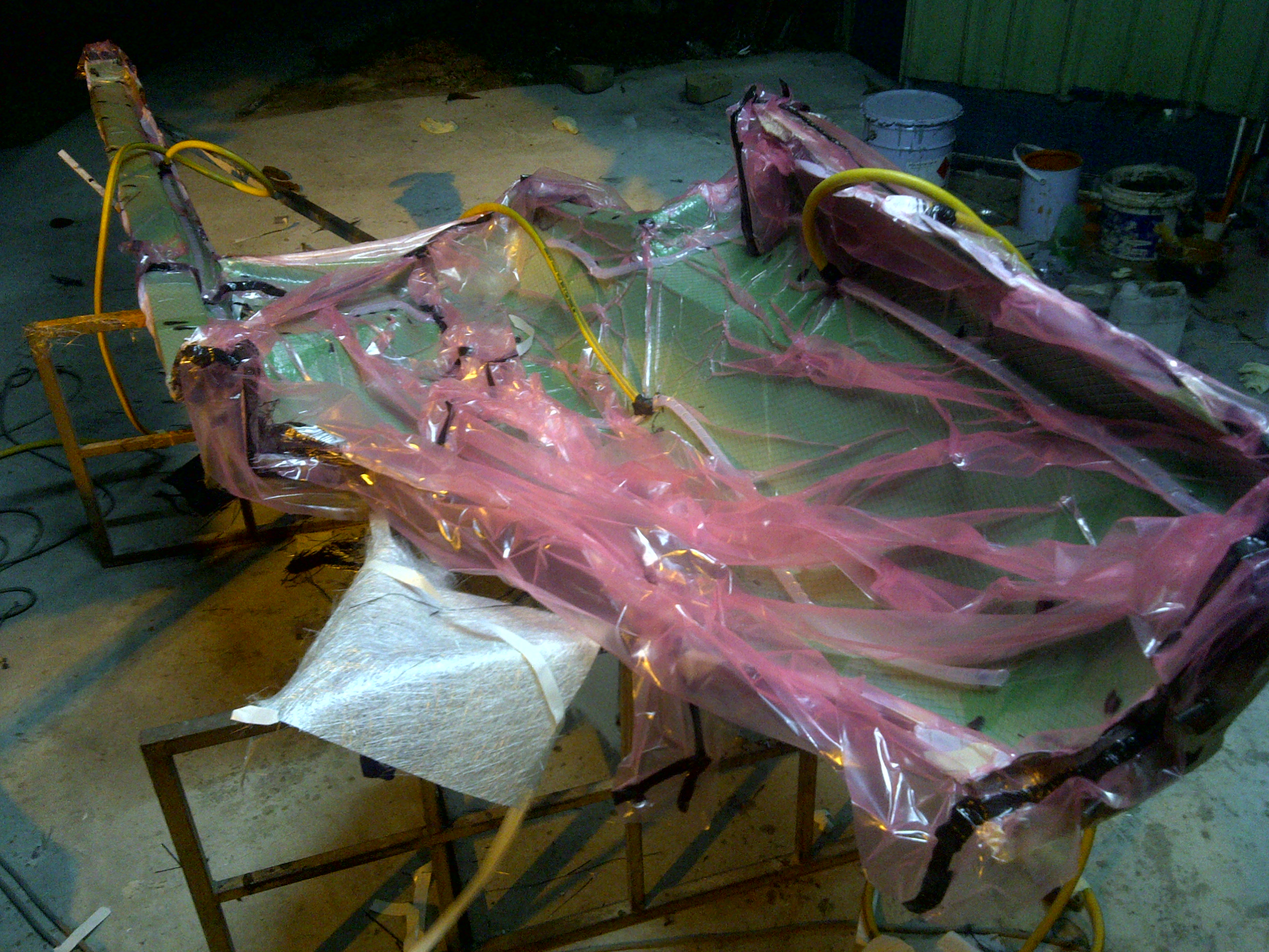 hehe. ya, method yang digunakan ada 2. hand layup dan vacuum infusion. ini kerna mereka mahu finishing gelcoat grey dan bukan clear seperti yang biasa kerna semua panel akan dicat semula.