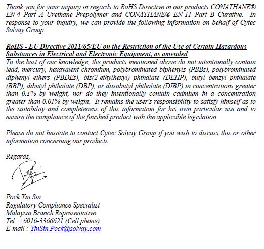 +x Jindrich - 6/16/2020 5:21:12 AM+x Matt (Staff) - 6/15/2020 3:33:39 PMHi Jindrich,RoHS applies to hazardous chemicals within electrical products, not the chemicals themselves. What I think you're asking for would be the safety datasheet (SDS) for the product which you can download from here.Please let me know if you need anything else.All the best, MattHi Matt,Thank you for your answer. We produce electronic devices and it must be RoHS compliant. Therefore we need RoHS certificate form all component which contain this devices. Chemical not excluded. One way is to substitute RoHS certificate with MSDS datasheet where is mentioned chemical composition of the chemical. Second possibility is to write some document as in attached picture. The SDS datasheet is good, but the chemical composition there not mentioned. Is possible to send MSDS datasheet or the document (as in example)?All the best ,Jindrich