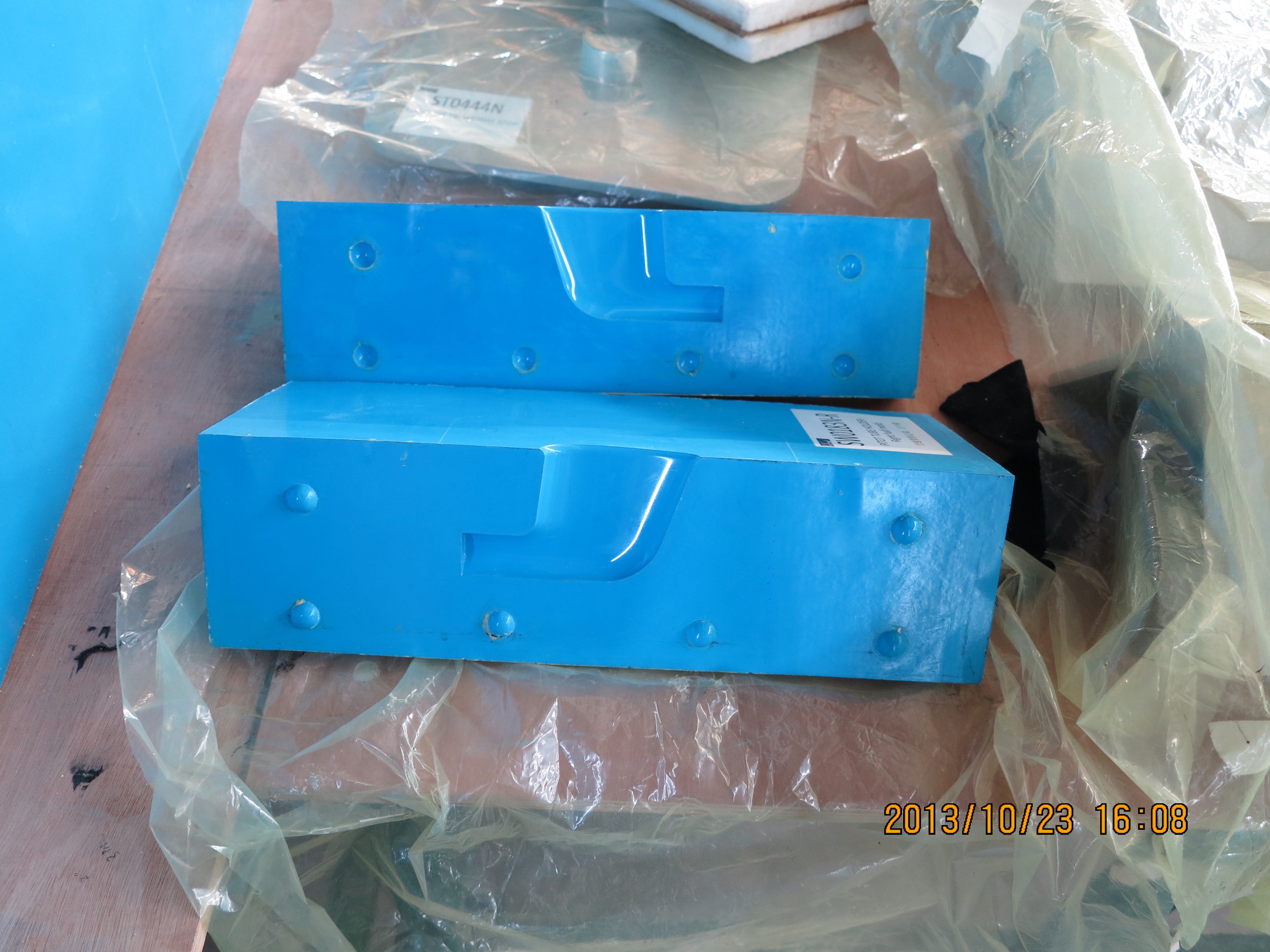 Once the resin has cured, remove the parting board, clean and wax the mold face, lay up the other half.  The shape of the marbles will make alignment perfect every time.  Picture show a marble still imbedded in a parting board with removed marbles beside it.  Other picture shows the locating pins in a mold set.