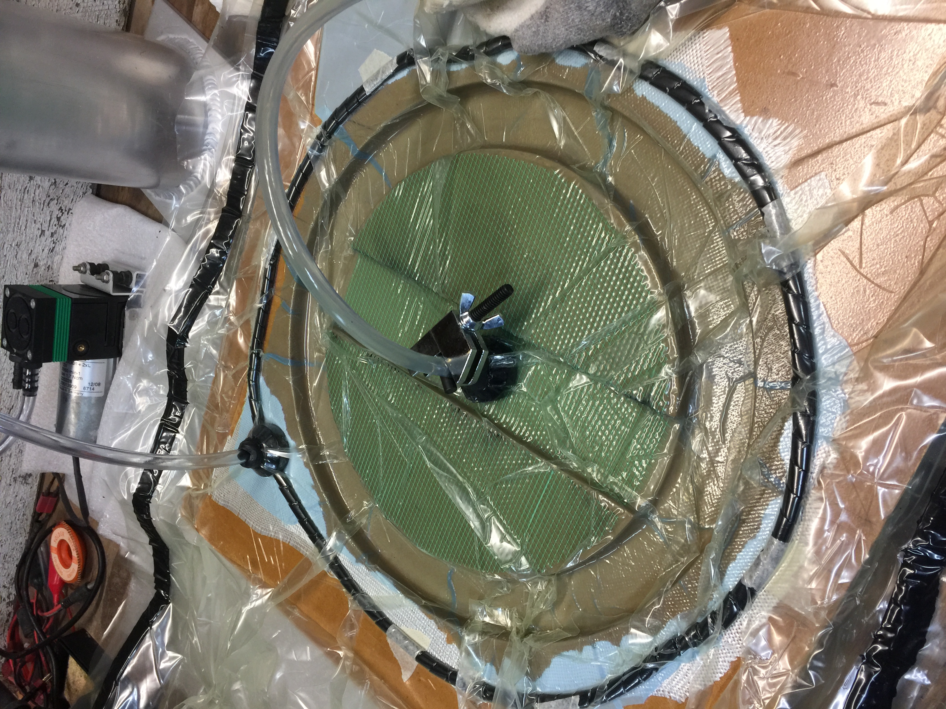 The mentioned effect has nothing to do with the oxygen bound in the water molecules. Although water molecueles break up from time to time this creates (small amounts of) oh- and h3o+ ions, and no oxygen. I am talking about physical solution. Every fluid/solid solutes molecules of the surrounding atmosphere. This depends on the substances involved, and the partial pressures. If you reduce the pressure of the system, you reduce the partial pressure of the surrounding atmosphere. As a result the substances in solution leave the liquid. In our infusion setup, we are talking mostly about water molecules (as far as I know), which solute quite well in epoxy resin.
