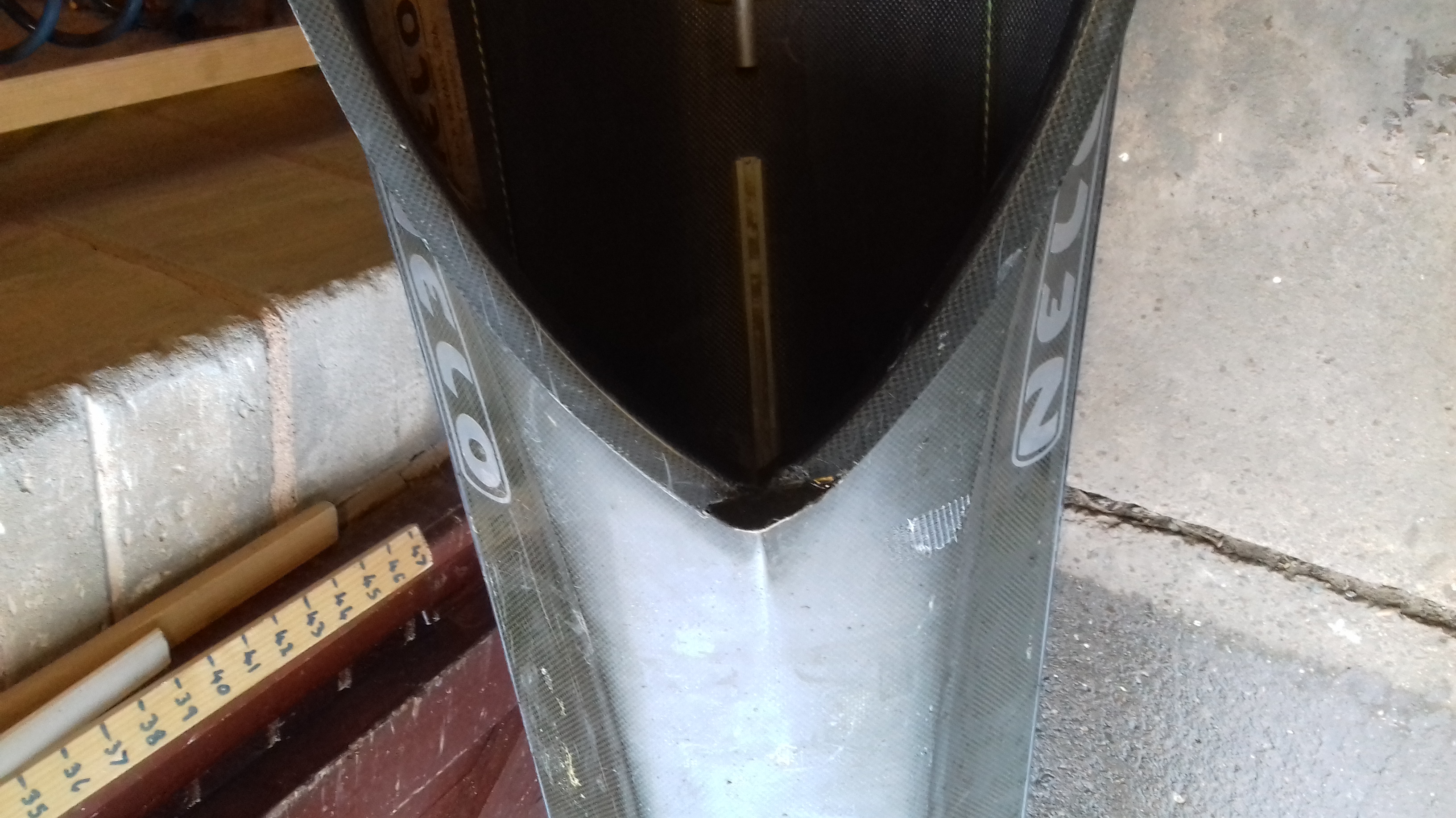 there should be a picture now showing the white areas (my repair) and the black areas of the original boat.